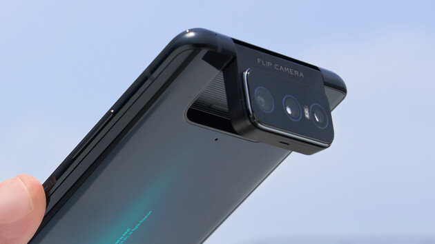 Auffällig sind bei diesen im High-End-Bereich angesiedelten Handsets vor allem die Kameras. Es gibt nämlich ein Kamera-Setup, bestehend aus drei Cams hinten — und keine Frontkamera. Das 6,67 Zoll große AMOLED-Display von Samsung wird also nirgends von einer Notch unterbrochen. Stattdessen setzt ASUS hier auf eine Klapp-Lösung, mit der die drei rückwärtigen Sensoren per Knopfdruck ausfahren und so auch für Selfies genutzt werden können.