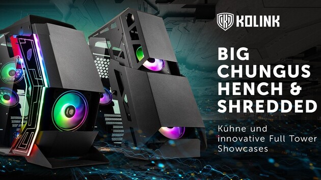 Kolinks Big Chungus Hench und Big Chungus Shredded sind zwar beide Show-Gehäuse, deren Design der Hersteller als „brachial“ bezeichnet, aber unterschiedlich auffällig. Eine halboffene Bauweise sowie eine Vielzahl Lüfter sollen die Temperaturen senken.