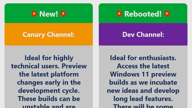 Microsoft kündigte an, dass der Canary Channel nicht für jedermann gedacht ist, sondern für „hoch technische“ Nutzer. Er richtet sich an diejenigen, die bereit sind, mit instabilen und unfertigen Builds zu arbeiten, die sehr häufig aktualisiert werden und möglicherweise schwerwiegende Fehler enthalten. Außerdem würden neue Insider-Builds im Canary-Kanal und enthaltene Features häufig ohne Dokumentation veröffentlicht werden. Microsoft warnt davor, dass der Canary Channel „nicht für den täglichen Gebrauch oder für produktive Geräte“ geeignet ist.